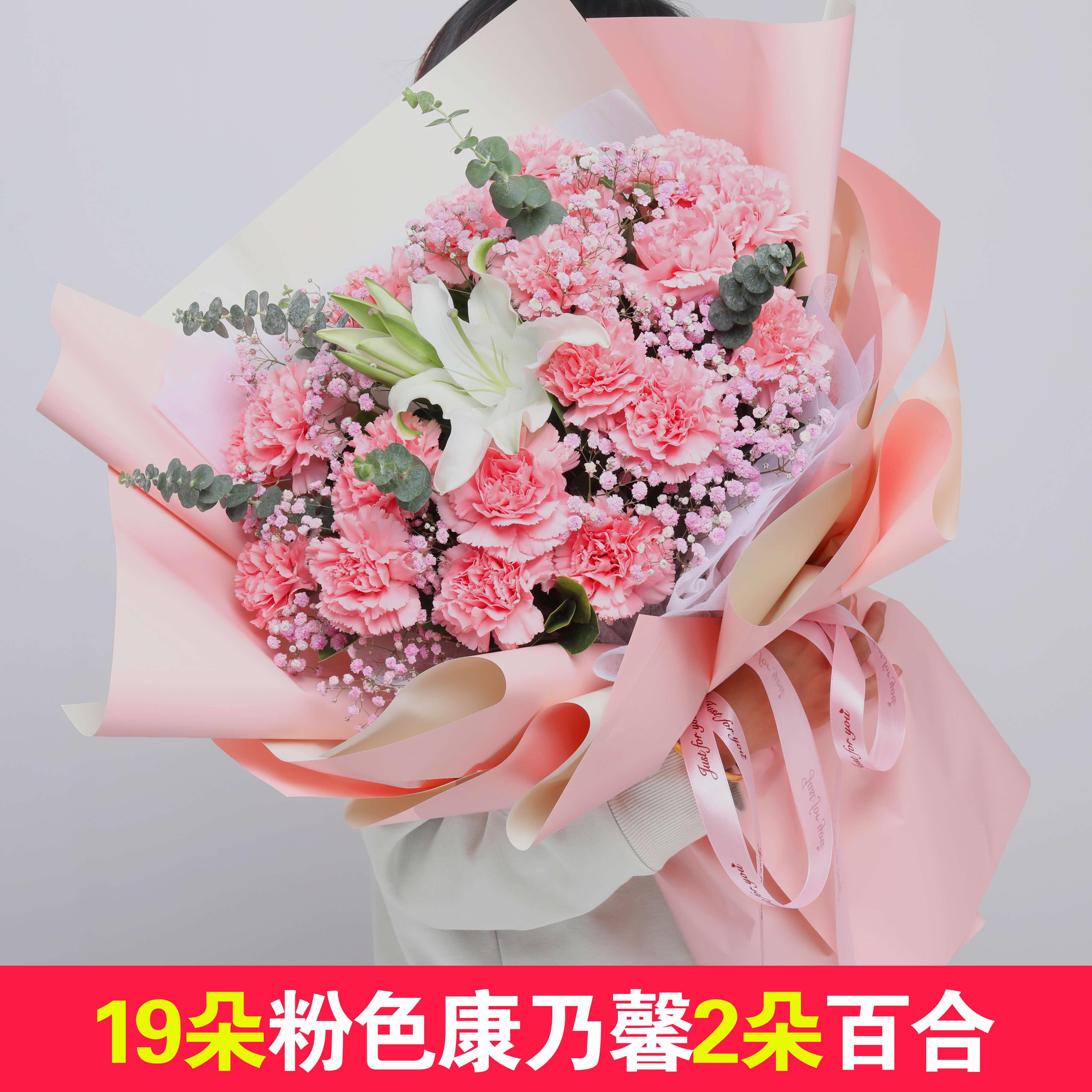 19朵粉色康乃馨搭配一支百合花束 由于鲜花都是鲜活的植物,属于一次性消费品、一但下单后安排我们不以任何理由申请退款的哦~ 请亲下单前一定要慎重考虑好、确认好收花人当天是否在您填写的收货地址~ 节日期间(如母亲节、七夕、情人节、妇女节、教师节、光棍节、平安夜,圣诞节等),鲜花价格均有上涨,具体请和客服联系确定,最终价格以双方商定为准! 以上节假日都只能当天送达,不接受定时送达,谢谢理解, 温馨提示: 鲜花是手工制作的商品,网页照片作为参考图片,具体已收到的实物照片为准,谢谢你的理解和支持!