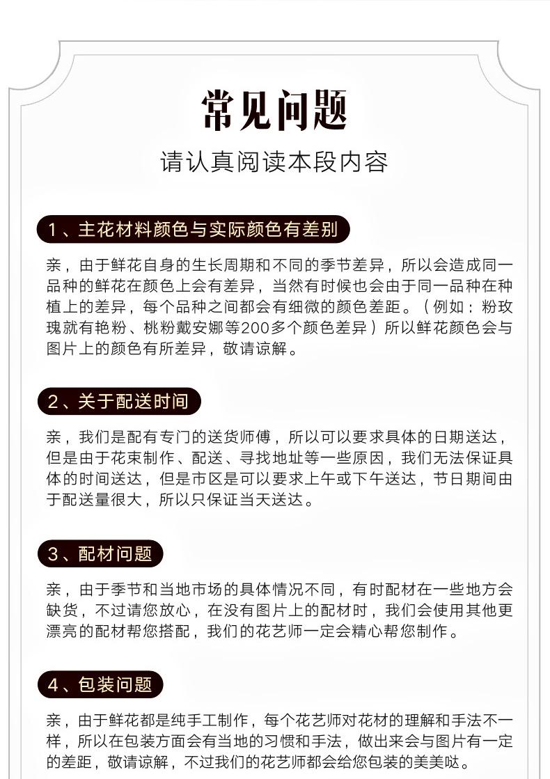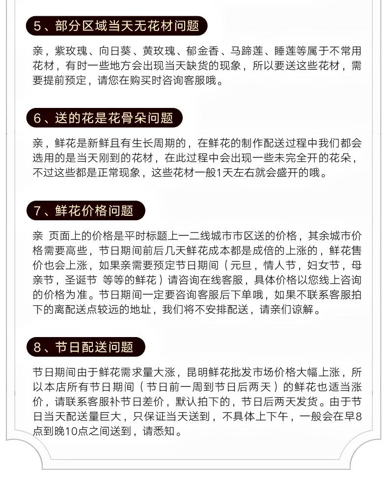 订购须知【关于节日】 由于鲜花都是鲜活的植物,属于一次性消费品、一但下单后安排我们不以任何理由申请退款的哦~ 请亲下单前一定要慎重考虑好、确认好收花人当天是否在您填写的收货地址~ 节日期间(如母亲节、520、七夕、情人节、妇女节、教师节、光棍节、平安夜,圣诞节等),鲜花价格均有上涨,具体请和客服联系确定,最终价格以双方商定为准! 以上节假日都只能当天送达,不接受定时送达,谢谢理解, 温馨提示: 鲜花是手工制作的商品,网页照片作为参考图片,具体已收到的实物照片为准,谢谢你的理解和支持!