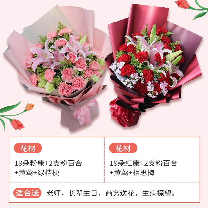花材:19朵康乃馨+6朵百合,黄英 ,桔梗,相思梅点缀 由于鲜花都是鲜活的植物,属于一次性消费品、一但下单后安排我们不以任何理由申请退款的哦~ 请亲下单前一定要慎重考虑好、确认好收花人当天是否在您填写的收货地址~ 节日期间(如母亲节、七夕、情人节、妇女节、教师节、光棍节、平安夜,圣诞节等),鲜花价格均有上涨,具体请和客服联系确定,最终价格以双方商定为准! 以上节假日都只能当天送达,不接受定时送达,谢谢理解, 温馨提示: 鲜花是手工制作的商品,网页照片作为参考图片,具体已收到的实物照片为准,谢谢你的理解和支持!