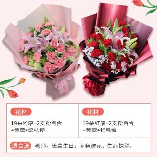 19朵康乃馨6朵百合鲜花花束 花材:19朵康乃馨+6朵百合,黄英 ,桔梗,相思梅点缀 由于鲜花都是鲜活的植物,... 235 元/次 花皇鲜花 已售3 好评100% 最快上门 0.5小时
