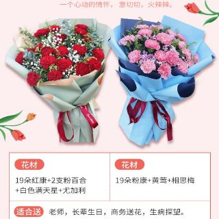 康乃馨同城鲜花速递 图片说明,19朵红色康乃馨尤加利,满天星点缀。19朵粉色康乃馨黄英相思梅点缀 由... 189 元/次 花皇鲜花 已售1 好评100% 最快上门 0.5小时